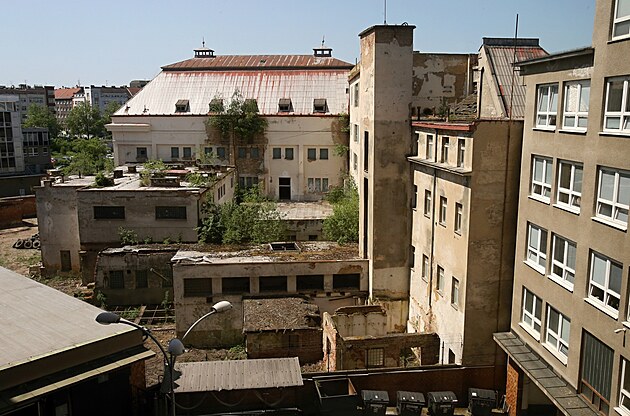 Pohled na vnitřní trakt zdevastovaných Městských lázní v Plzni (29. května 2023)