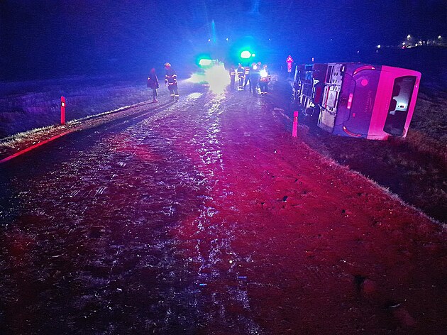 U obce Střapole na Rokycansku havaroval v úterý v noci autobus. Na silnici byla silná vrstva bahna. (8. října 2024)