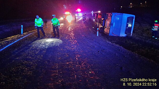 U obce Střapole na Rokycansku havaroval v úterý v noci autobus. Na silnici byla silná vrstva bahna. (8. října 2024)
