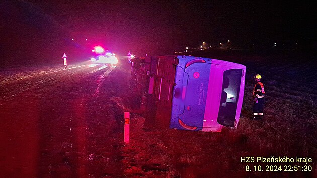 U obce Střapole na Rokycansku havaroval v úterý v noci autobus. Na silnici byla silná vrstva bahna. (8. října 2024)