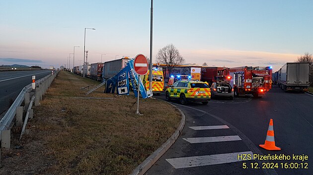 Nehoda na dálnici D5 u Rokycan. Třiatřicetiletý muž narazil s autem do svodidel, vylétl z dálnice a narazil do zaparkovaného nákladního vozidla. (5. prosince 2024)