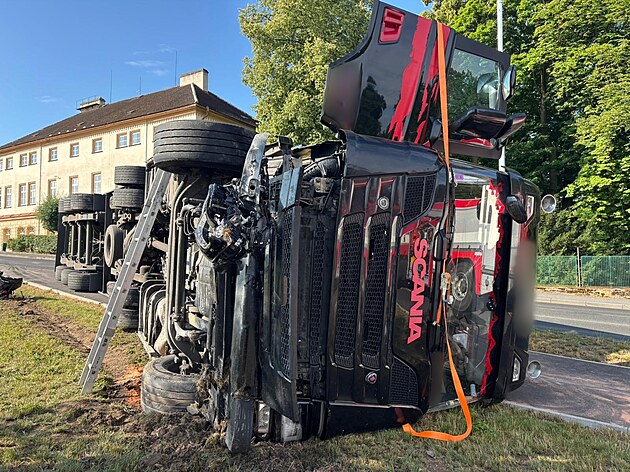 Kamion zůstal po nehodě v Klatovech ležet na boku. To komplikovalo hasičům řešení úniku nafty z jeho nádrže. (11. července 2025)
