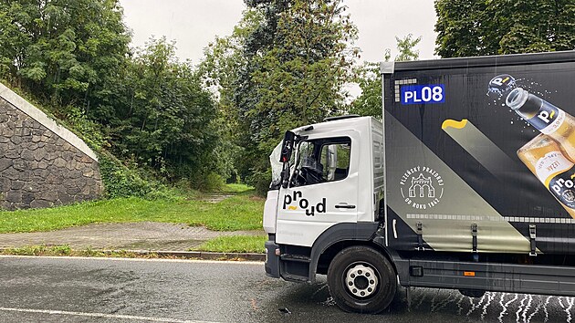 Z převáženého pracovního stroje se za jízdy uvolnilo rameno s ovládacím pultem a zdemolovalo kabinu protijedoucího nákladního auta. Nehoda se stala v Plzni na Jateční třídě. (5. září 2025)