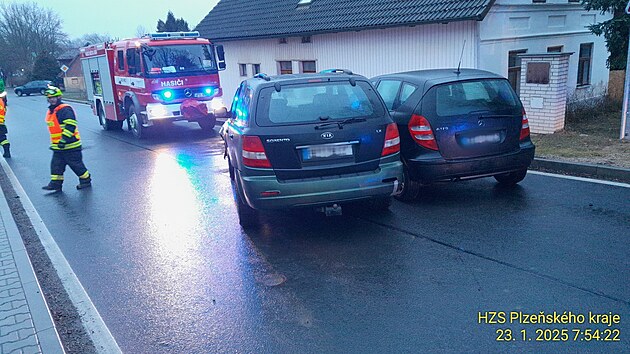 Na Tachovsku se ve čtvrtek ráno stalo několik dopravních nehod kvůli namrzlým silnicím. Snímek je z Čečkovic nedaleko Boru. (23. ledna 2025)
