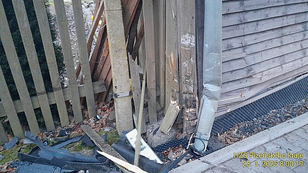 Hasiči hlásí z Tachovska řadu dopravní nehod kvůli silné námraze. Snímek je z Čečkovic, kde se srazila dvě osobní auta a při tom došlo k poškození veřejného osvětlení a domu. (23. ledna 2025)