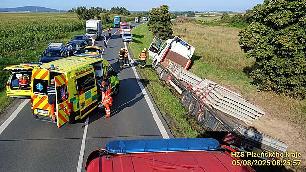 Na hlavním tahu mezi Plzní, Domažlicemi a Německem zkolaboval v úterý ráno šofér kamionu naloženého betonovými panely. Souprava skončila v příkopu, řidiče museli záchranáři dlouhé minuty oživovat. (5. srpna 2025)