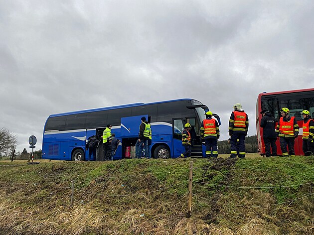 Tragická nehoda se stala v pátek před polednem u Nepomuku na Plzeňsku. V osobním autě po srážce s autobusem zemřel starší řidič. Pro cestující z autobusu přijel jiný autobus. (3. února 2023)