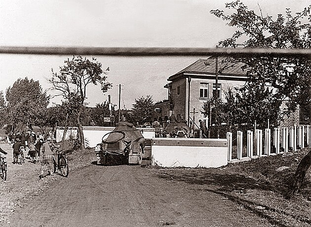 Průjezd kolony obrněných vozů SdKfz 221 výhybným zařízením č. 2 před folmavskou celnicí 8. října 1938