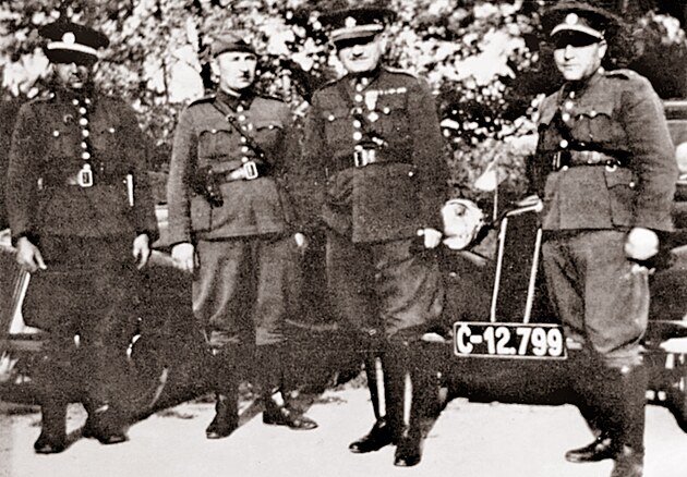 Velitel praporu SOS Domažlice Jaroslav Herkloc na inspekci 4. čety u Folmavy na jaře 1938