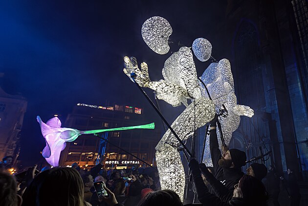 Plzeňské náměstí zaplnili diváci, které přilákala multimediální show s videomappingem a obřími světelnými loutkami zvanými Dundu. (8. března 2025)