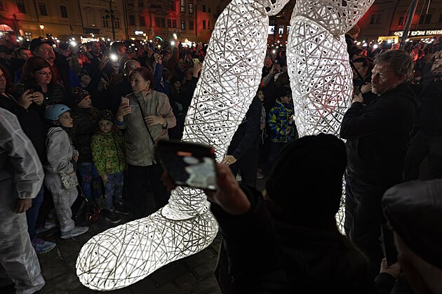 Plzeňské náměstí zaplnili diváci, které přilákala multimediální show s videomappingem a obřími světelnými loutkami zvanými Dundu. (8. března 2025)