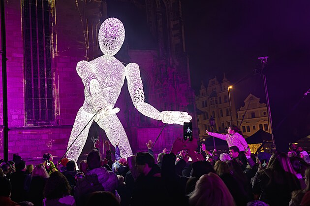 Plzeňské náměstí zaplnili diváci, které přilákala multimediální show s videomappingem a obřími světelnými loutkami zvanými Dundu. (8. března 2025)