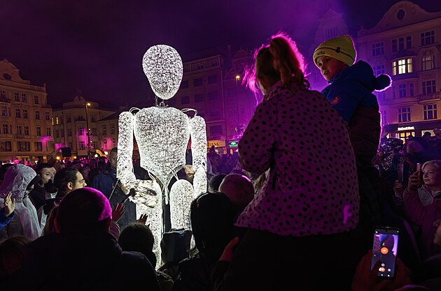 Plzeňské náměstí zaplnili diváci, které přilákala multimediální show s videomappingem a obřími světelnými loutkami zvanými Dundu. (8. března 2025)