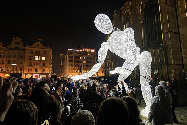 Plzeňské náměstí zaplnili diváci, které přilákala multimediální show s videomappingem a obřími světelnými loutkami zvanými Dundu. (8. března 2025)