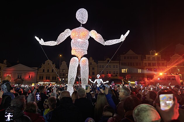 Plzeňské náměstí zaplnili diváci, které přilákala multimediální show s videomappingem a obřími světelnými loutkami zvanými Dundu. (8. března 2025)