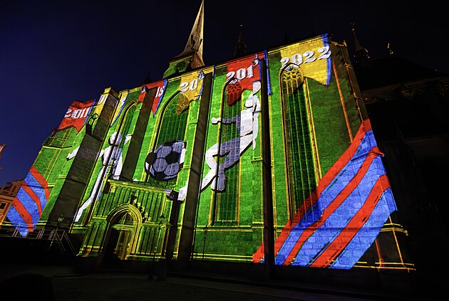 Plzeňské náměstí zaplnili diváci, které přilákala multimediální show s videomappingem a obřími světelnými loutkami zvanými Dundu. (8. března 2025)