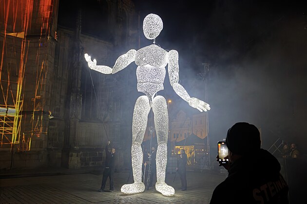 Plzeňské náměstí zaplnili diváci, které přilákala multimediální show s videomappingem a obřími světelnými loutkami zvanými Dundu. (8. března 2025)