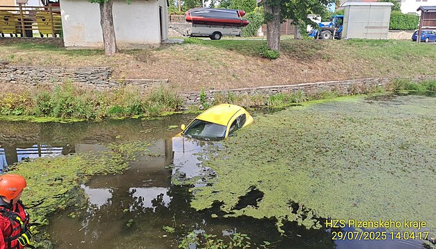 Špatně zabrzděné auto sjelo do rybníčku uprostřed Ostrova u Bezdružic na Plzeňsku. Vytáhli ho hasiči se svým vyprošťovacím speciálem. (29. července 2025)