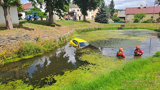 Špatně zabrzděné auto sjelo do rybníčku uprostřed Ostrova u Bezdružic na Plzeňsku. Vytáhli ho hasiči se svým vyprošťovacím speciálem. (29. července 2025)