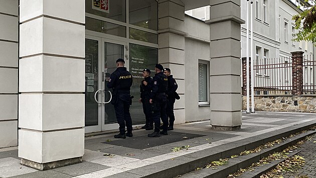 Jednání o vazbě probíhalo ve večerních hodinách na Okresním soudu Plzeň-sever. Obviněný L. S. dorazil k soudu v šaškovském oblečení. (10. října 2024)