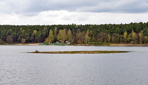 Hladina Velkého Boleveckého rybníka v Plzni pomalu stoupá díky umělému dopouštění z Berounky. Voda už zaplavuje ostrůvek uprostřed rybníka a také náletové dřeviny uchycené na březích, které byly léta bez vody. (25. 4. 2023)