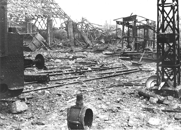 Nálet Britů na Plzeň 17. dubna 1945. Na snímku je zničená výtopna na hlavním nádraží.