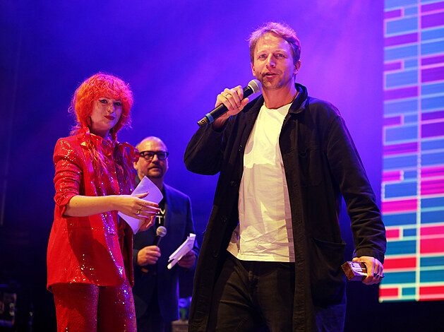 Tomáš Klus při slavnostním udílení cen Žebřík. Klus cenu dostal v kategorii Zpěvák roku za druhé a třetí místo v letech 2019 a 2020. Letos se kvůli koronavirovým omezením vyhlašovaly hned dva ročníky najednou. (3. září 2021)
