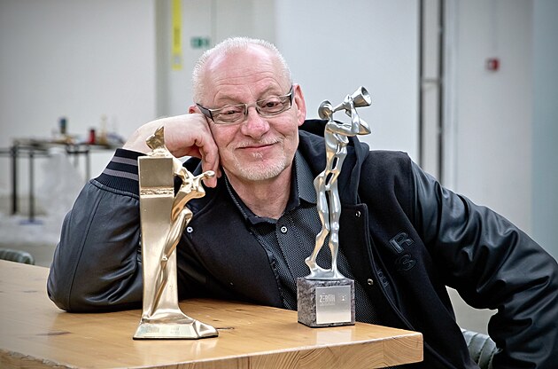 Tisková konference před vyhlášením 32. ročníku hudební ankety Žebřík. Na snímku autor cen, sochař Václav Česák. (2. dubna 2024)