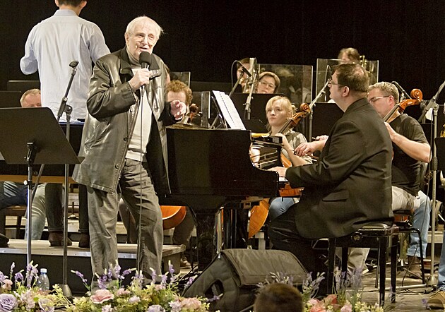 Plzeňský rodák Jiří Suchý a Jitka Molavcová vystoupili v Měšťanské besedě v Plzni v rámci cross-over koncertu Plzeňské filharmonie. (21. 10. 2021)