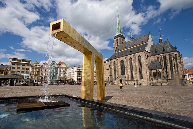 Kašny na náměstí Republiky v Plzni po zimní pauze a údržbě před sezonou opět chrlí vodu. (25. 4. 2023)