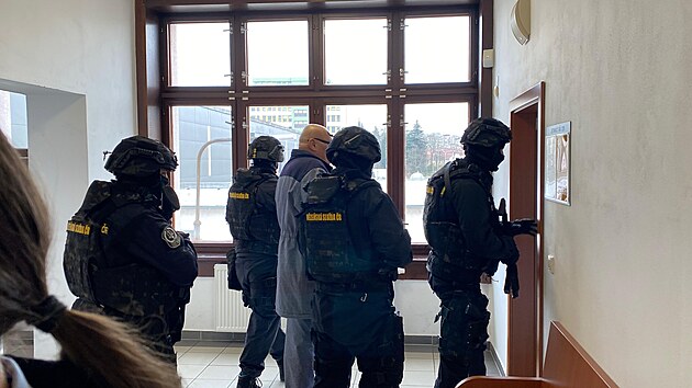 Doživotně odsouzený sedmašedesátiletý Josef Kott u Okresního soudu v Sokolově. K soudu ho přivedli příslušníci vězeňské služby. (6. února 2025)