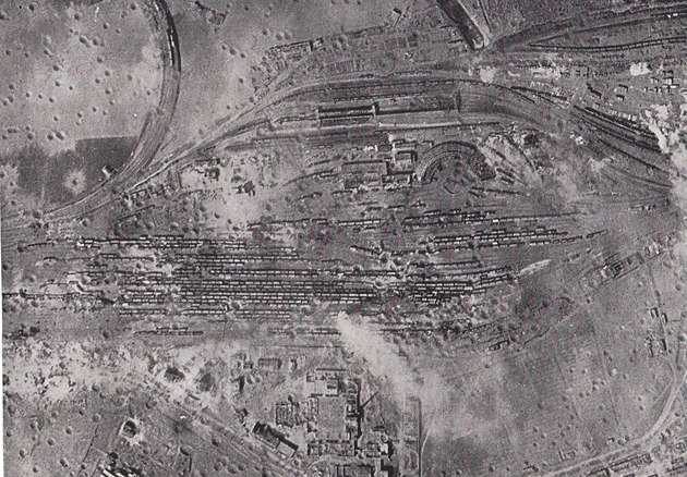 Seřaďovací nádraží v Plzni po náletu. Viditelné jsou krátery po dopadech pum.