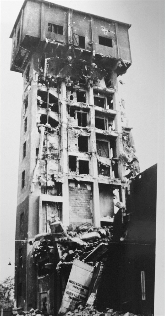 Plzeň po náletu 25. dubna 1945. Sklad modelů, který byl nejvyšší budovou Škodovky.