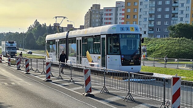 Projekt tramvajové trati na plzeňské sídliště Vinice propaguje neobvykle Správa veřejného statku města Plzně usazením tramvaje do míst, kde by jednou měla kolejová doprava sloužit. (14. 9. 2021)