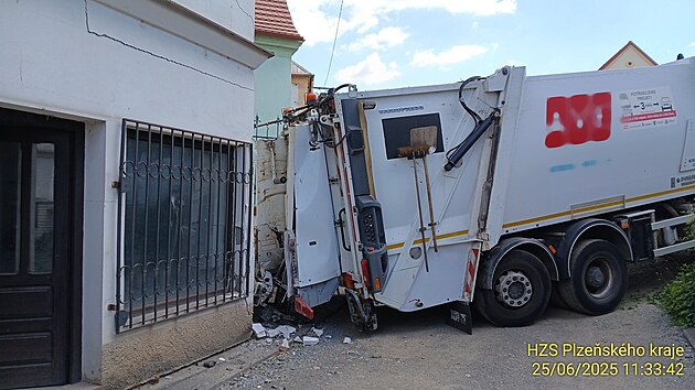 Popelářské auto sjelo v Plzni na Rolnickém náměstí na dům a probouralo se do zdi. Hasiči musejí zajistit jeho statiku. (25. června 2025)