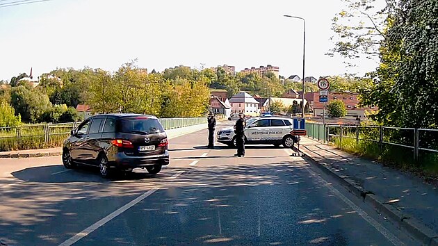 Kvůli výstavbě vodovodu a kanalizace je Rolnické náměstí v Plzni uzavřené. O zákazu vjezdu do oblasti informují dopravní značky. V pondělí stáli před mostem v Lobezské ulici strážníci. (12. května 2025)