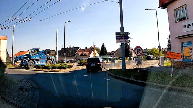 Kvůli výstavbě vodovodu a kanalizace je Rolnické náměstí v Plzni uzavřené. O zákazu vjezdu do oblasti informují dopravní značky. Snímek je z kruhového objezdu u Částkovy ulice. (12. května 2025)