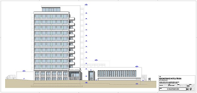 Návrh studie přestavby bývalého hotelu Škoda, pohled z východní strany.