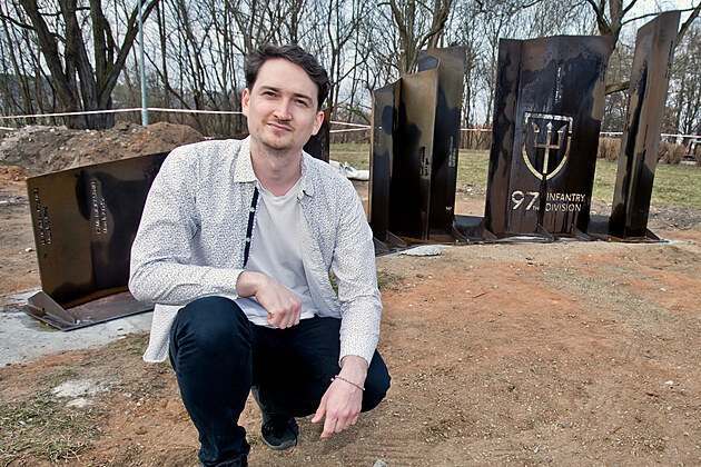 Architekt David Foud, autor nového pomníku 97. pěší divize americké armády, který stojí v parčíku u Křimické ulice v Plzni-Skvrňanech. (12. března 2025)