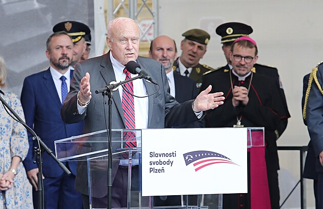 Pietním aktem u památníku Díky, Ameriko! Plzeňané uctili 78. výročí osvobození americkou armádou. na snímku vnuk generála Pattona George Patton Waters. (6. 5. 2023)