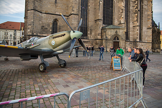 Maketa letadla Supermarine Spitfire vystavená v rámci Slavností svobody na náměstí Republiky v Plzni. Maketa slavného letadla je měřítku 1:1. (8. 5. 2021)