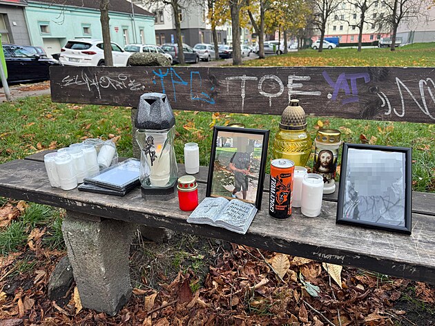 Na lavičce, nedaleko domu, kde mladík zemřel násilnou smrtí, vzniklo malé pietní místo. (20. listopadu 2024)