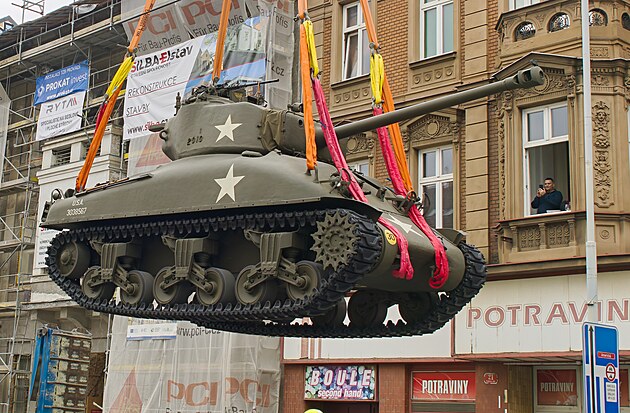 Speciální jeřáb přemístil přes střechu objektu na Klatovské třídě v Plzni třicetitunový tank M4 Sherman do nové přístavby. Náročná akce trvala jen pár minut. (11. října 2025)