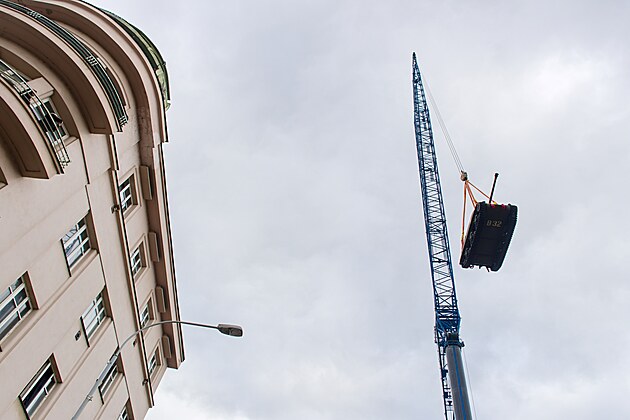 Speciální jeřáb přemístil přes střechu objektu na Klatovské třídě v Plzni třicetitunový tank M4 Sherman do nové přístavby. Náročná akce trvala jen pár minut. (11. října 2025)