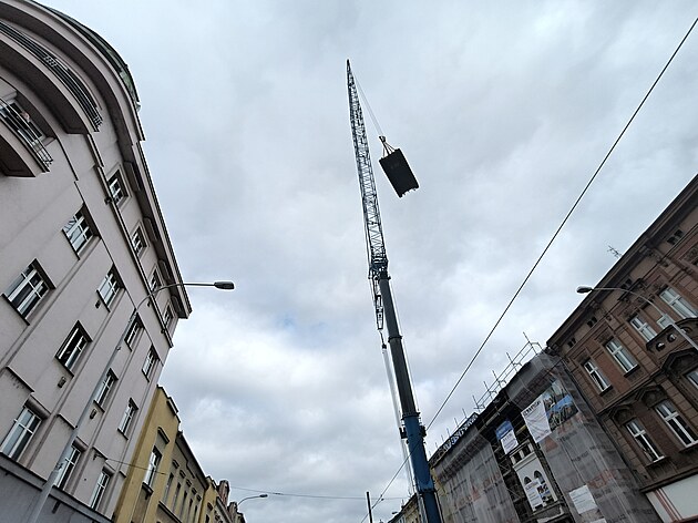 Speciální jeřáb přemístil přes střechu objektu na Klatovské třídě v Plzni třicetitunový tank M4 Sherman do nové přístavby. Náročná akce trvala jen pár minut. (11. října 2025)