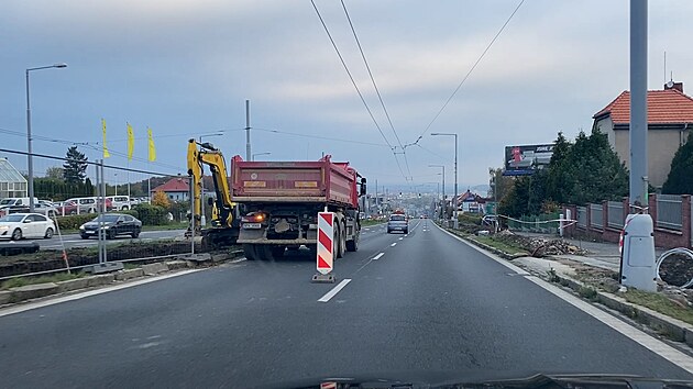 Stavbaři pokládají potrubí uprostřed Rokycanské v Plzni