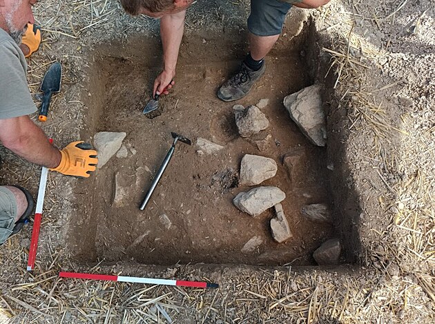 Odkrytá část hrobu s bronzovým náramkem.