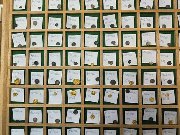 Ukázka zlatých a stříbrných keltských mincí v průběhu jejich laboratorního zpracování.