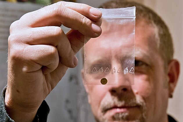 Archeologové představili nálezy keltských mincí a dalších předmětů z dosud utajovaného místa na severním Plzeňsku. Na snímku archeolog David Daněček se zlatou mincí - osminou stateru. (25. září 2025)