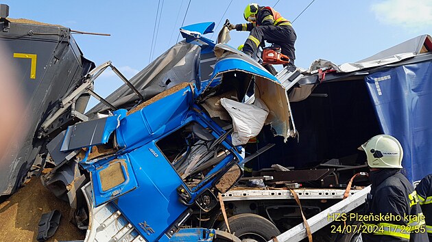 Dálnici D5 na 67,5 km ve směru na Rozvadov uzavřela ve středu odpoledne dopravní nehoda tří kamionů. Jeden z řidičů zemřel. (24. července 2024)